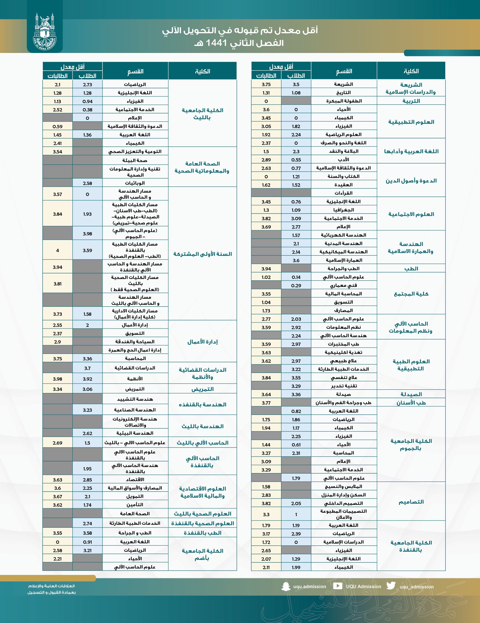 تخصصات جامعة ام القرى الزاهر. معدل القبول في التخصصات بجامعة أم القرى 1442. ويبلغ عدد كليات جامعة أم القرى ومعاهدها 35، والأقسام 119، والتخصصات 215، والبرامج 596، والعمادات 11، ومراكز البحث العلمي 12، والجمعيات العلمية 8، والمجلات العلمية 7، والصحف. سيتم الإعلان عن أسماء المقبولين في جامعة أم القرى السعودية في يوم 11 ذي القعدة. تخصصات جامعة أم القرى ومن أهم تخصصات جامعة ام القرى التي تسمح للبنات في التسجيل بها ومن هذه التخصصات ما يلي: